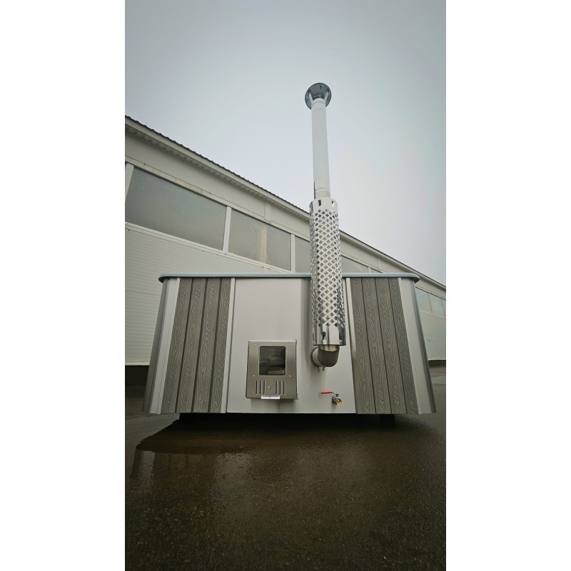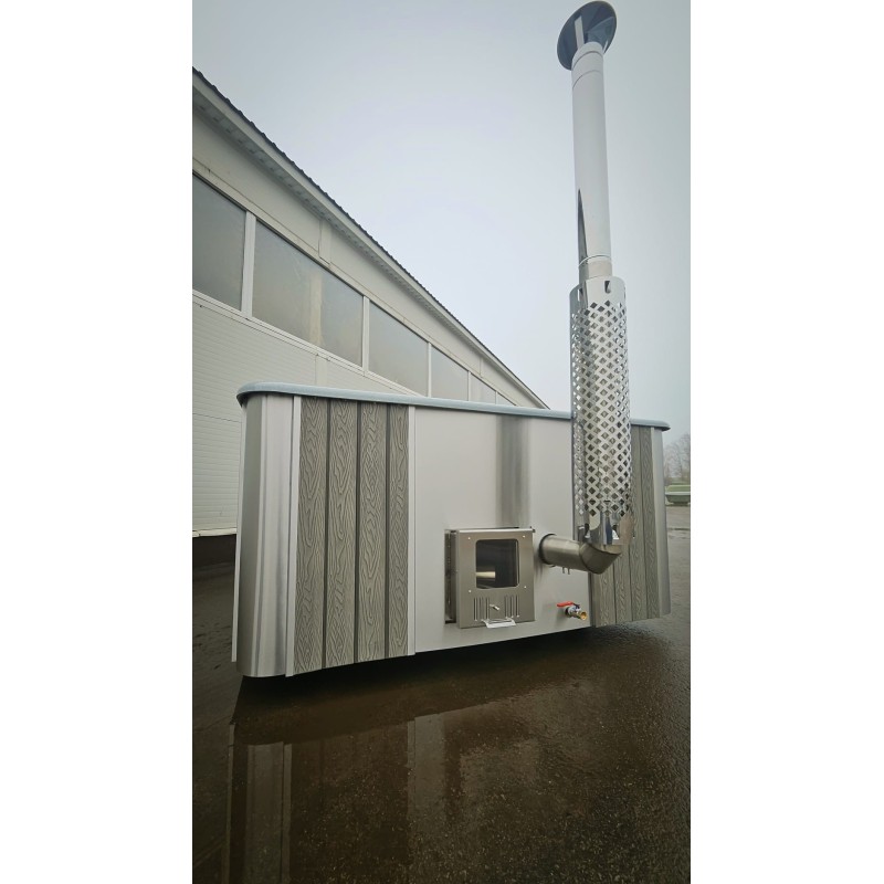 26 kW galingumo krosnelė įmontuota kubilo šone, todėl nereikia papildomos vietos lauke. Vanduo įšyla greitai – vos per 1,5–2 valandas.