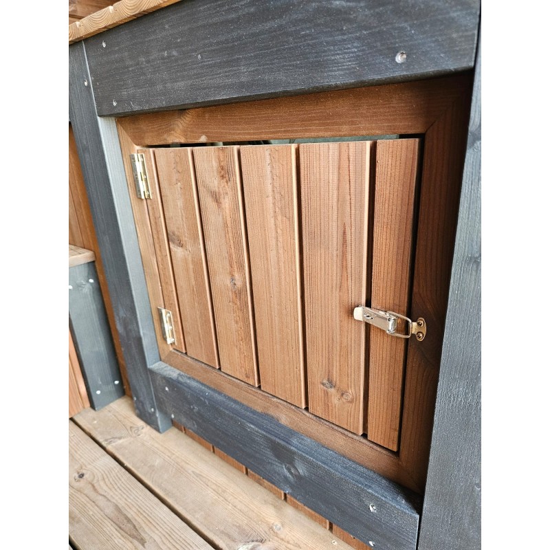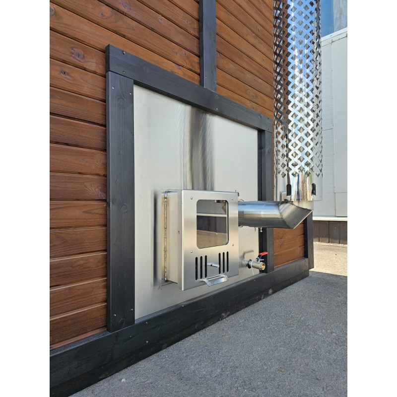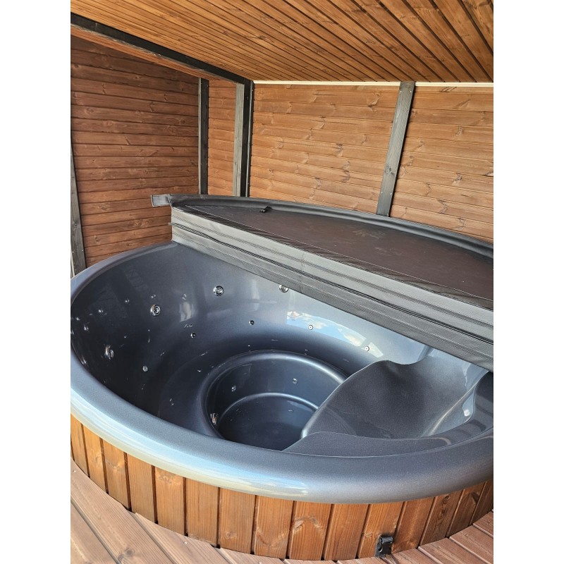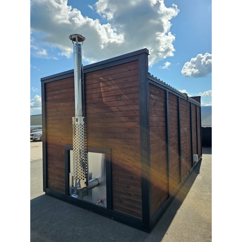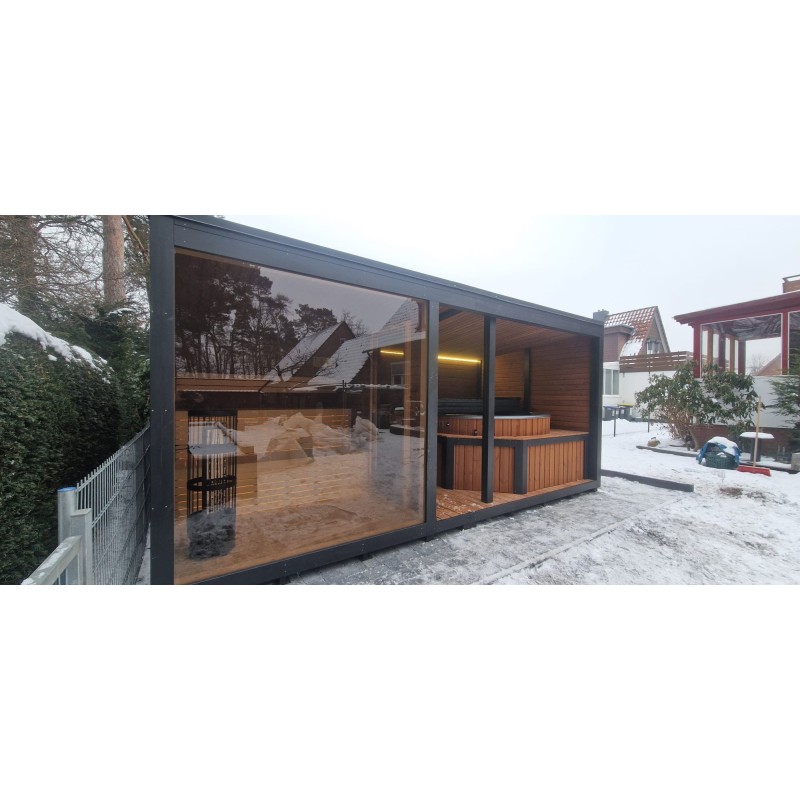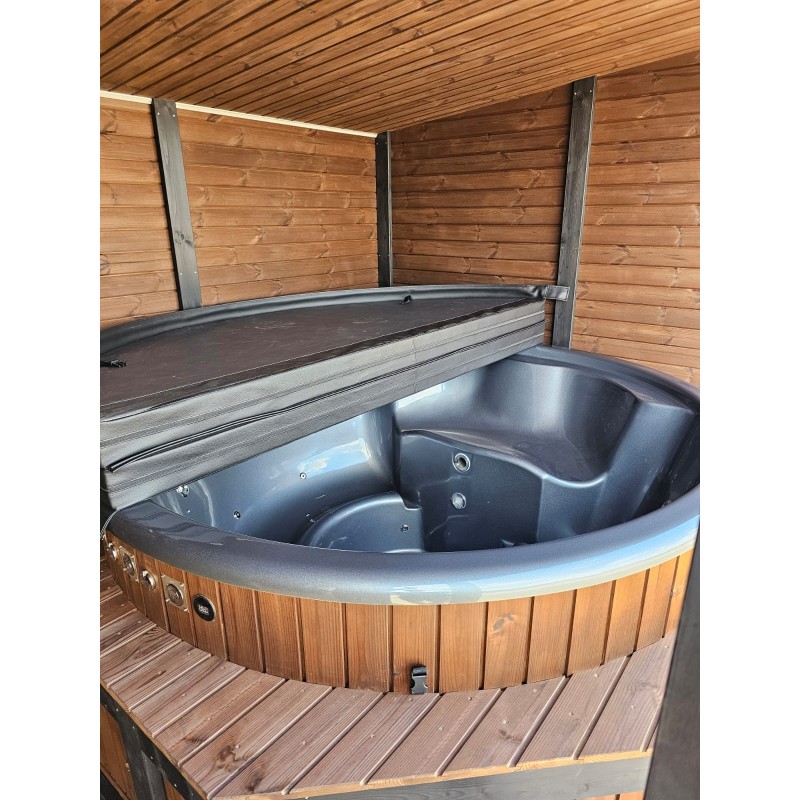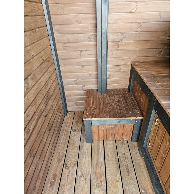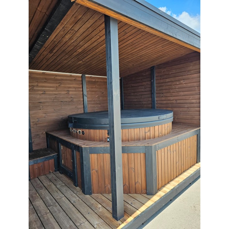 Vidiniai matmenys - Sauna 220 cm x 200 cm, Kubilo zona 220 cm x 220 cm (išorinis kubilo skersmuo 200 cm), 100 cm terasa.